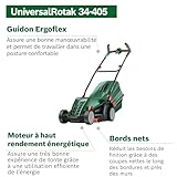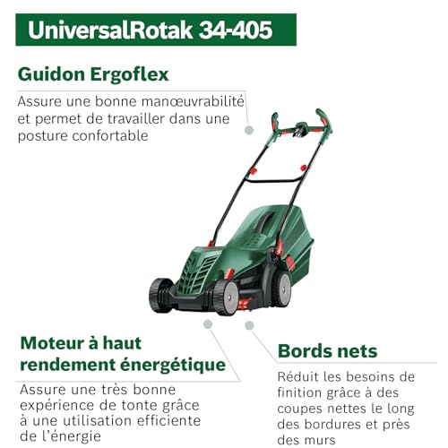 Bosch Tondeuse à Gazon Filaire UniversalRotak 34-405 (Moteur de 1 300 W, Largeur de Coupe : 34 cm, bac de ramassage 40 litres, pour la Tonte Uniforme de pelouses en Laissant des Bordures Propres)